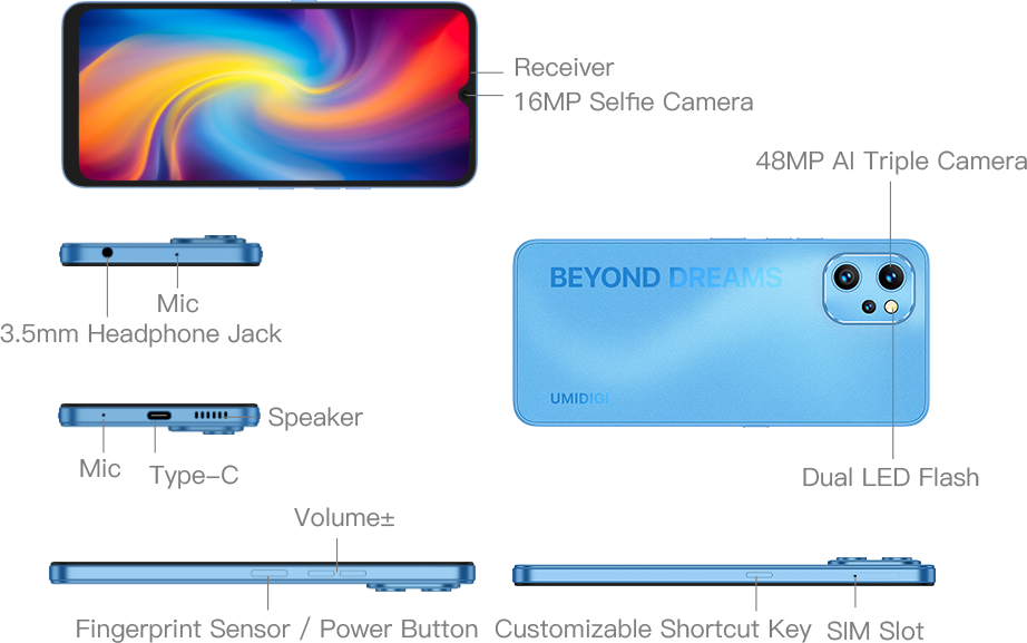 Height:168mm *Data provided by UMIDIGI lab. Industry measurement methods may vary, and therefore actual results may differ. |