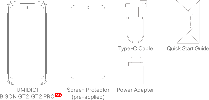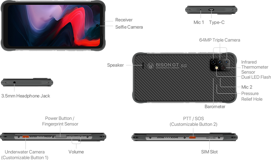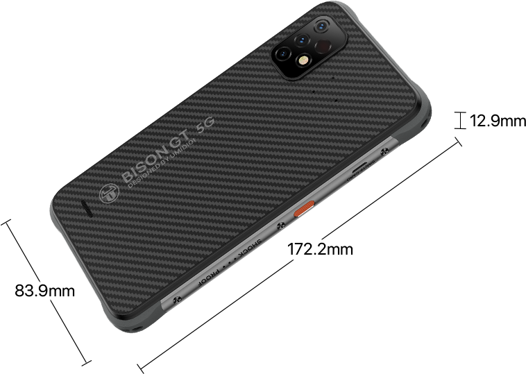 Up To 8GB + 256GB*LPDDR4X + UFS 2.1 *BISON GT2 5G is 8GB + 128GB, BISON GT2 PRO 5G is 8GB + 256GB. Available storage and RAM are less than the total memory due to storage of the operating system and software pre-installed on the device. |